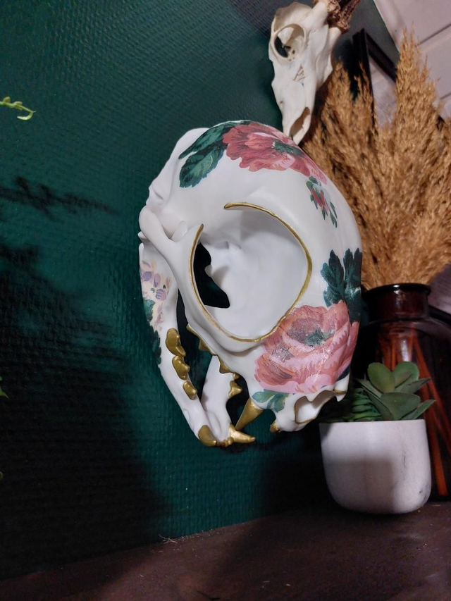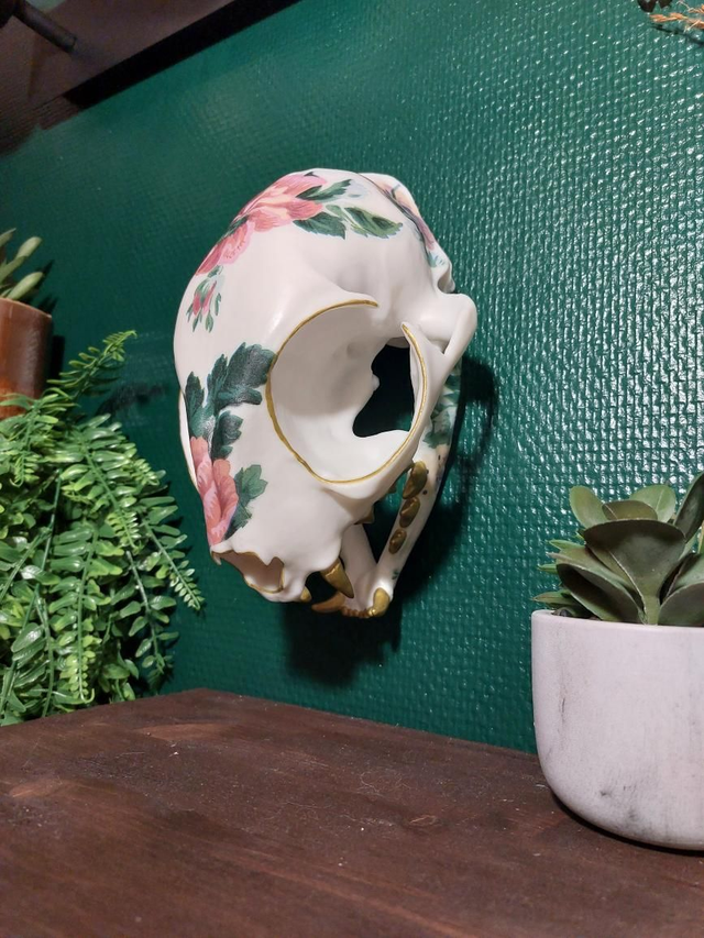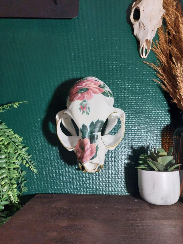 Grand crâne de chat avec fleurs vintage à accrocher au mur.